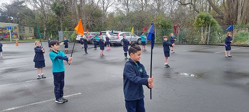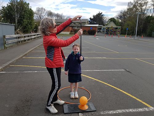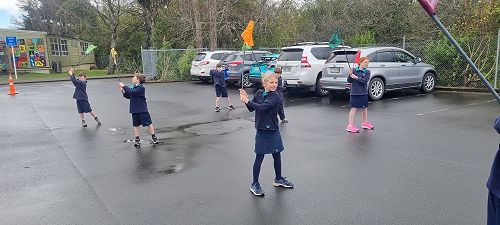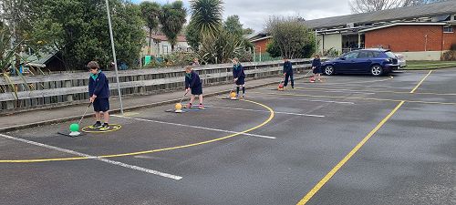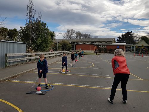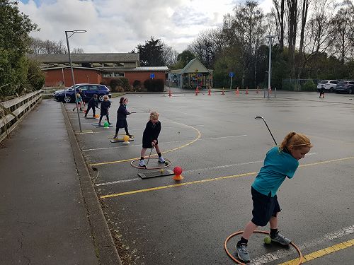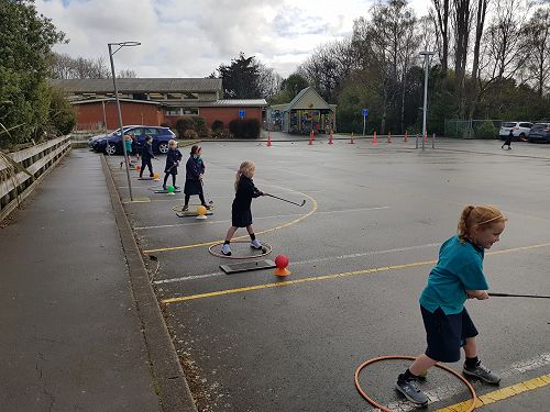 Room 34 was really excited when we were told we would go and play some golf with Melanie, (the golf instructor.) We were led out to the right hand side of the field and waited on the stone path until the class before us finished their turn. When they did, we all ran over and stood behind a bright red flag plunged into the ground. Melanie introduced herself and spoke us through how to play, using some examples with kids. Questions were asked as we were told to go over to the colourful flags and wait at one, as Melanie walked over behind us. There, we followed the instructions of picking the flag up, holding it properly and swinging from the right, nice and slowly, then at a higher speed to the left. Once we got the hang of the basics we went back to the red flag and got sorted into groups, depending on height. One person started golf, while two others stood at the coloured flag further away, but still in front of the golfers they were paired with.