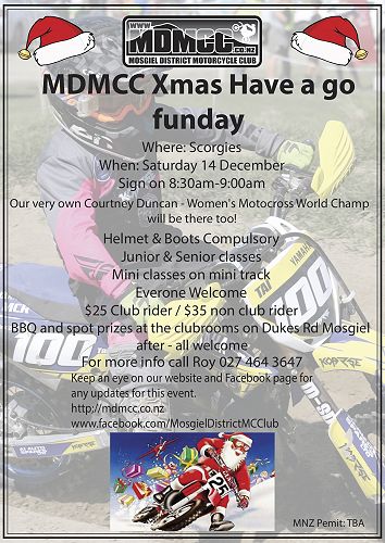 Please find the attached information flyer in regards to the Mosgiel District Motorcycle club Fun day held on Saturday 14 December 2019.
