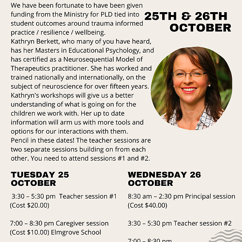 Visit this articleThe Ministry of Education has funded PLD sessions for principals, teachers and parents tied into student outcomes around trauma informed practice/resilience/wellbeing - see attached information. Parent/Caregiver session is to be held in the Elmgrove School Hall on Tuesday 25 October 7pm - 8.30pm. Registration details below.