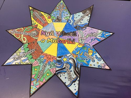 Our learning started with learning the names and meanings of the 9 whetu. Our big buddies, Ruru Ono, collaborated with us to make a gigantic whetu (star) with all the names and visual images that are connected to each whetu (star).