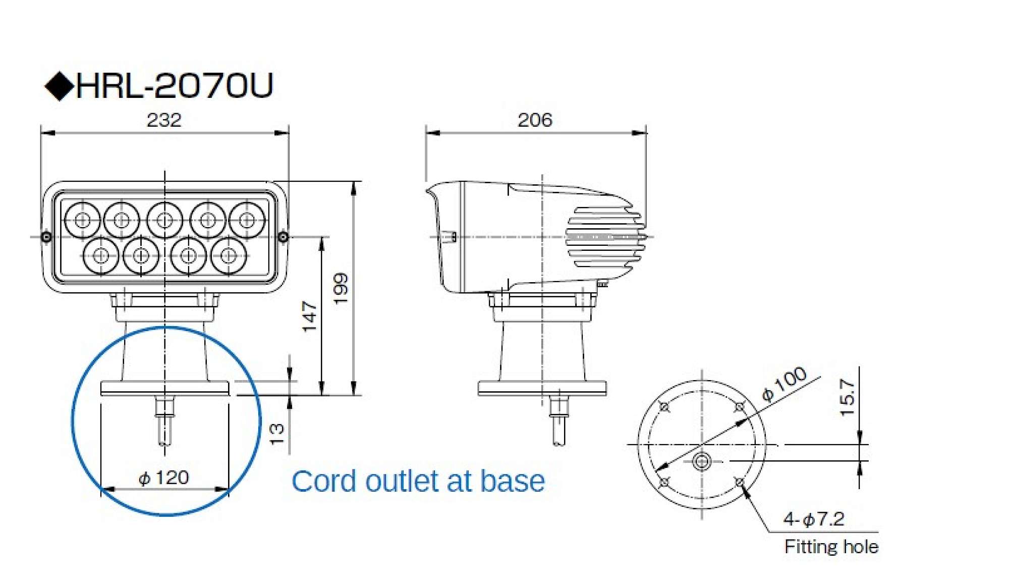 The robust searchlight housing is made from diecast aluminum and finished in a hard white coating, and the waterproof enclosed housing has excellent resistance to corrosion by severe wind, rain and waves.