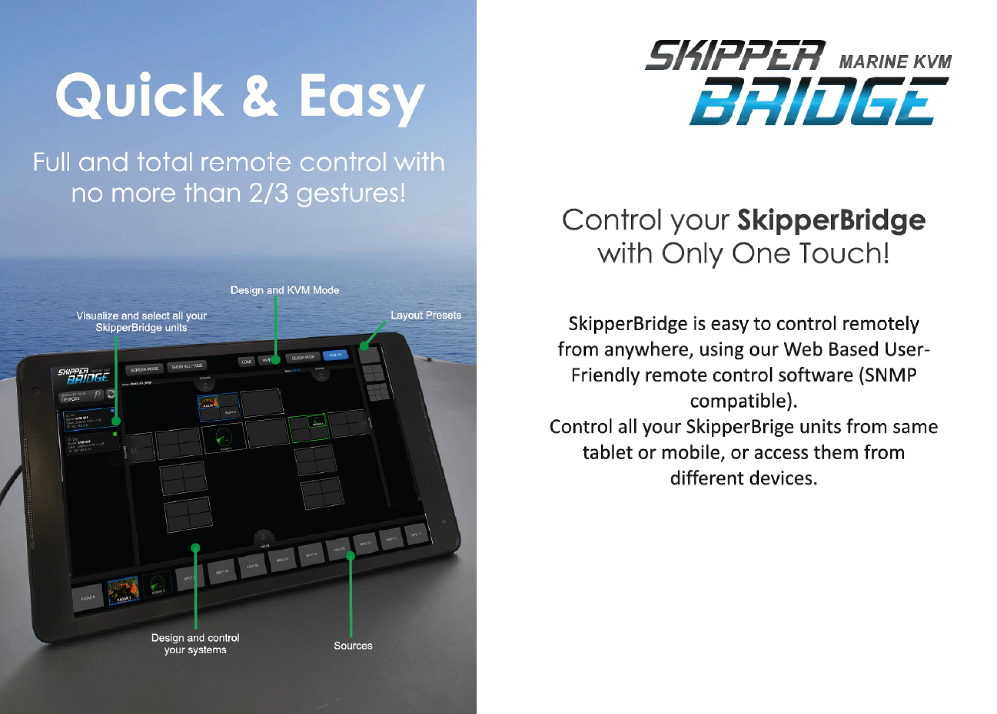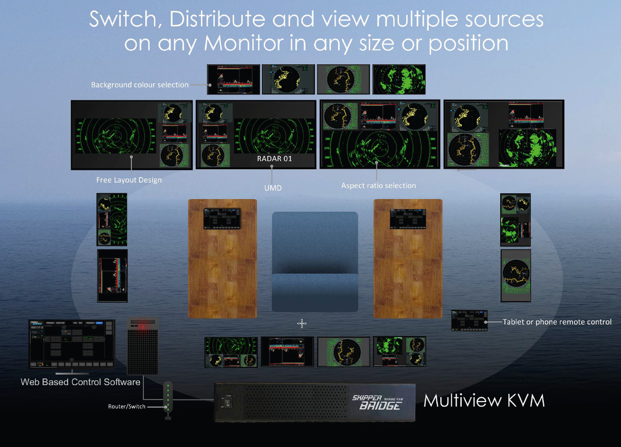 Custom-designed with the maritime skipper in mind, Skipperbridge is an all-in-one hardware based KVM Multiview Matrix with routing and touch tablet control, with a raft of unique features.