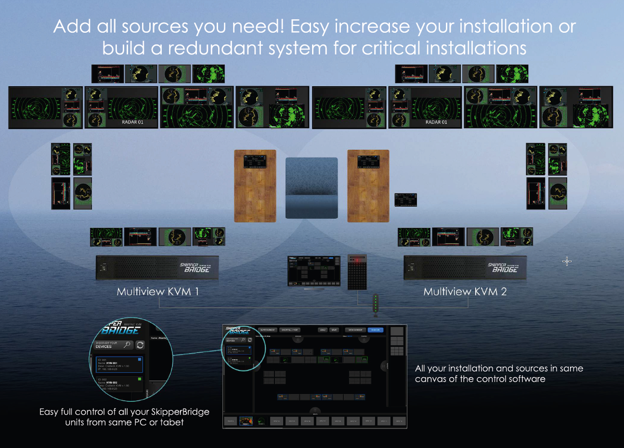 - Multiple Skipperbridge units can be networked, and configured for centralised control of all sources and screens via one (or more) trackball/tablets