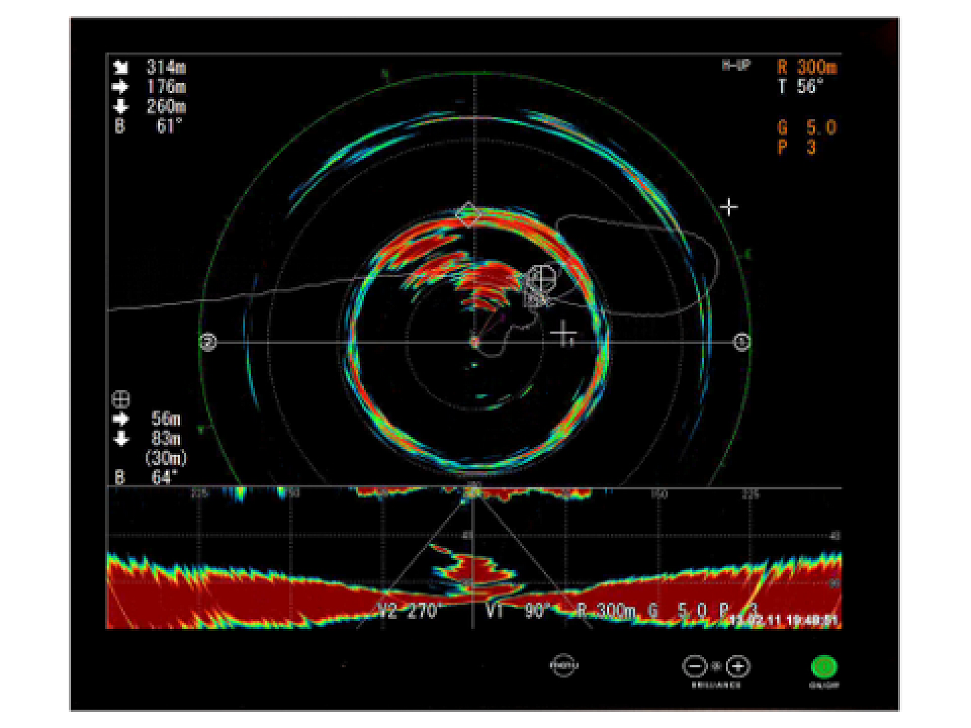 - Fish estimate feature to compare the volume of two schools of fish. This fish concentration and histogram displays help you decide when to set your net (sonar can display the relative volume of fish before you shoot)