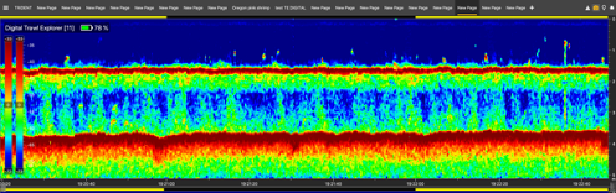 Echogram @0.76 s - temperature, depth, pitch, roll, battery level @3.8 s