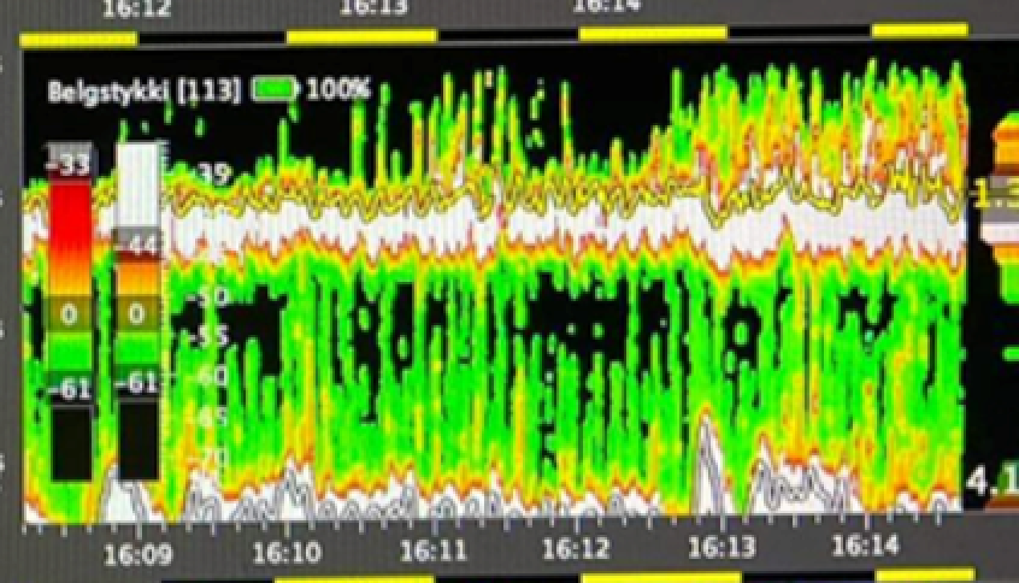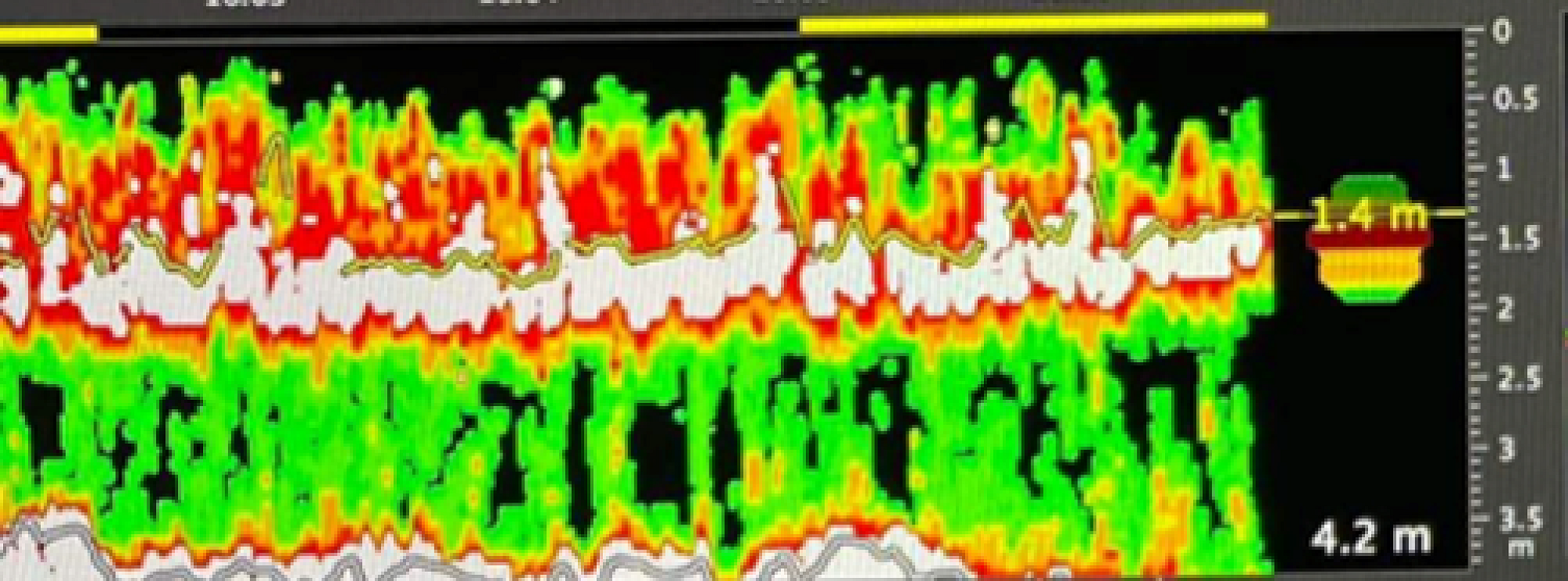 You can see from the above image, the range of the sounding is automatically reduced when the sensor gets closer to the bottom, in order to have better quality images. 1. Initial range (80 meters) / 2. Switches to a 20-meter range / 3. Switches to a 10-meter range / 4. Target detection: Pollock school