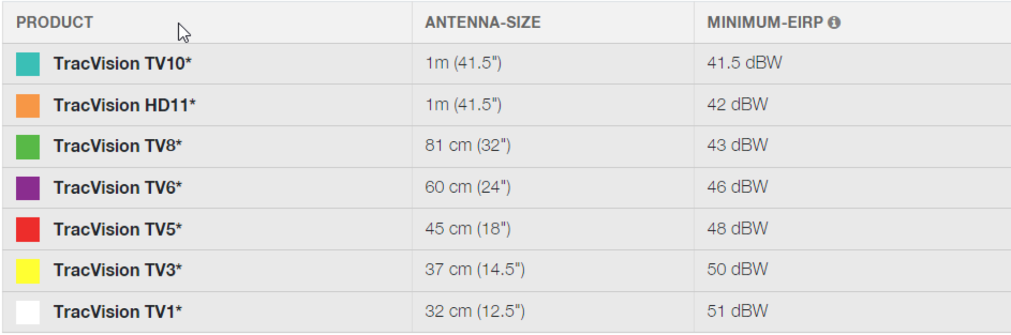 The coverage maps for these satellites are provided as reference only and may change in the future or could be impacted by weather conditions. KVH provides no guarantees of satellite coverage, satellite availability, programming available on any specific satellite service, or compatibility of the TracVision® system with new satellites that may be launched in the future. Please note that all Minimum EIRP values are average approximate figures that may vary according to actual transponder frequency and location.