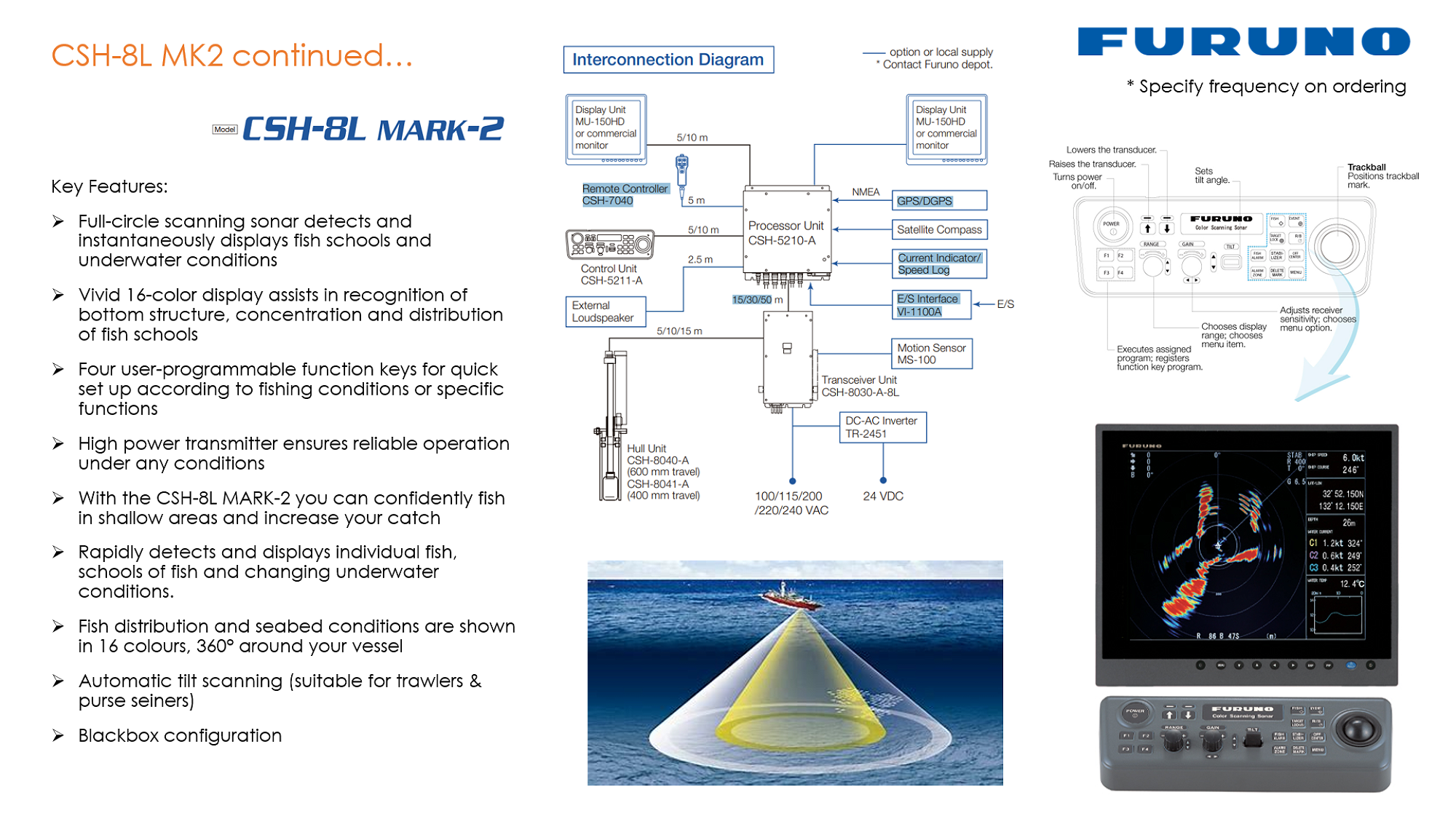 The FURUNO CSH-8L Mk2 is a "go to" omni directional sonar for Sport & Commercial fishers worldwide looking to hunt pelagic fish. At 85kHz it is perfect for species like Tuna & Marlin.