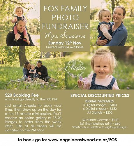 Do you need a family photo for a New Year card or Christmas card? Would you like to give a family photo as a gift? You can get this done in November and help the school too! Angela, a Fendalton School mum and professional photographer will be setting up a studio on Sunday 11 November. You book online, bring the family along and Angela supplies all the photos for you. Here's the link to book and for more information: http://www.angelaeastwood.co.nz/fos.html.