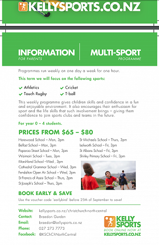 If you are interested in enrolling in the sessions email braedon@kellysports.co.nz There are sessions on other days at different locations around town.