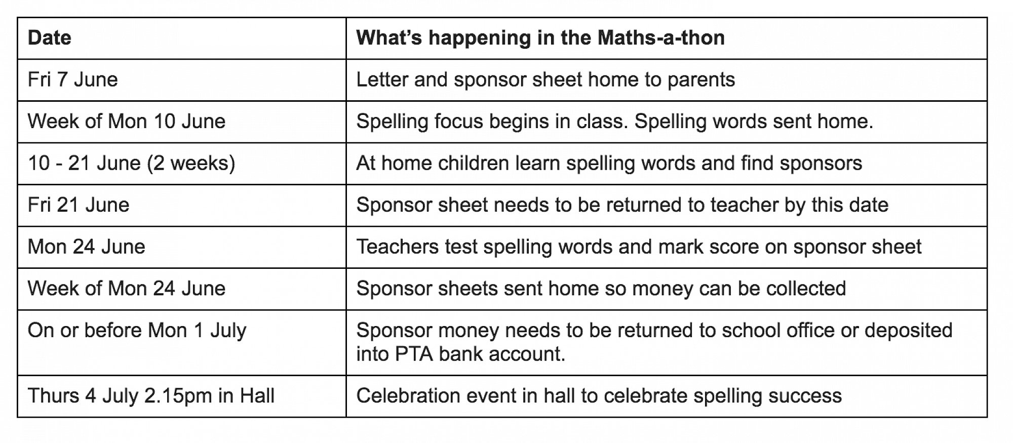 In the next couple of weeks, we will be holding our Spell-a-thon. This is a school-wide focus on spelling with optional fund-raising through sponsorship. A letter will be brought home by your child next week explaining everything. Keep a lookout for the spelling words sent home by the teacher. Here are some key dates for you.