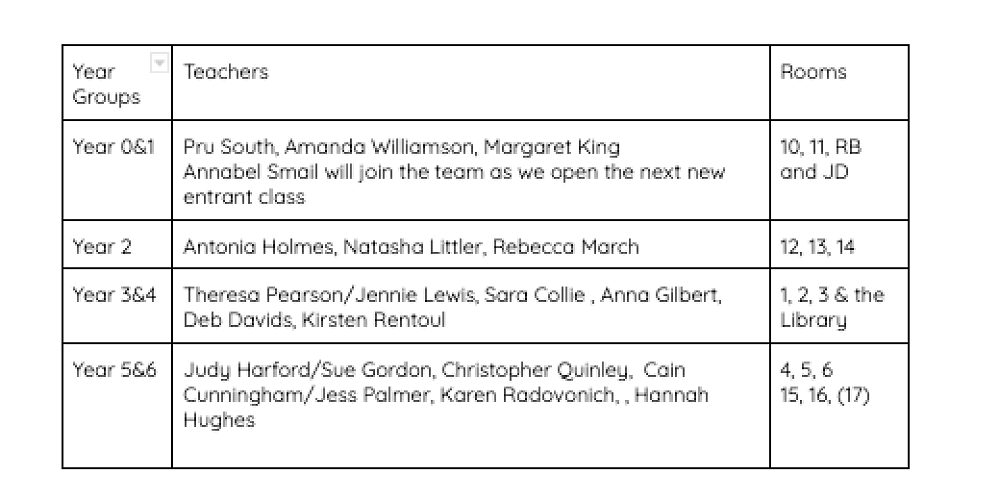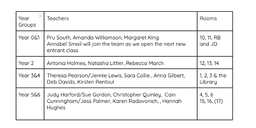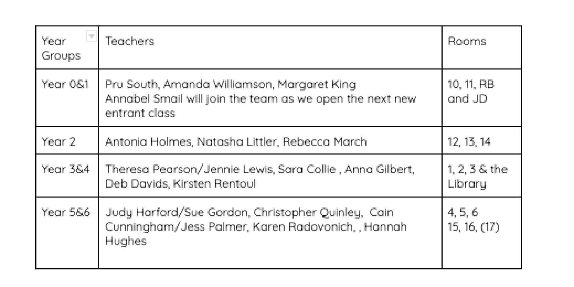 The staffing and structure of the school will be as follows for next year and the rooms are for term 1 at this stage as we hope to be moving into the new junior block in term 2 and then there will be changes needed.