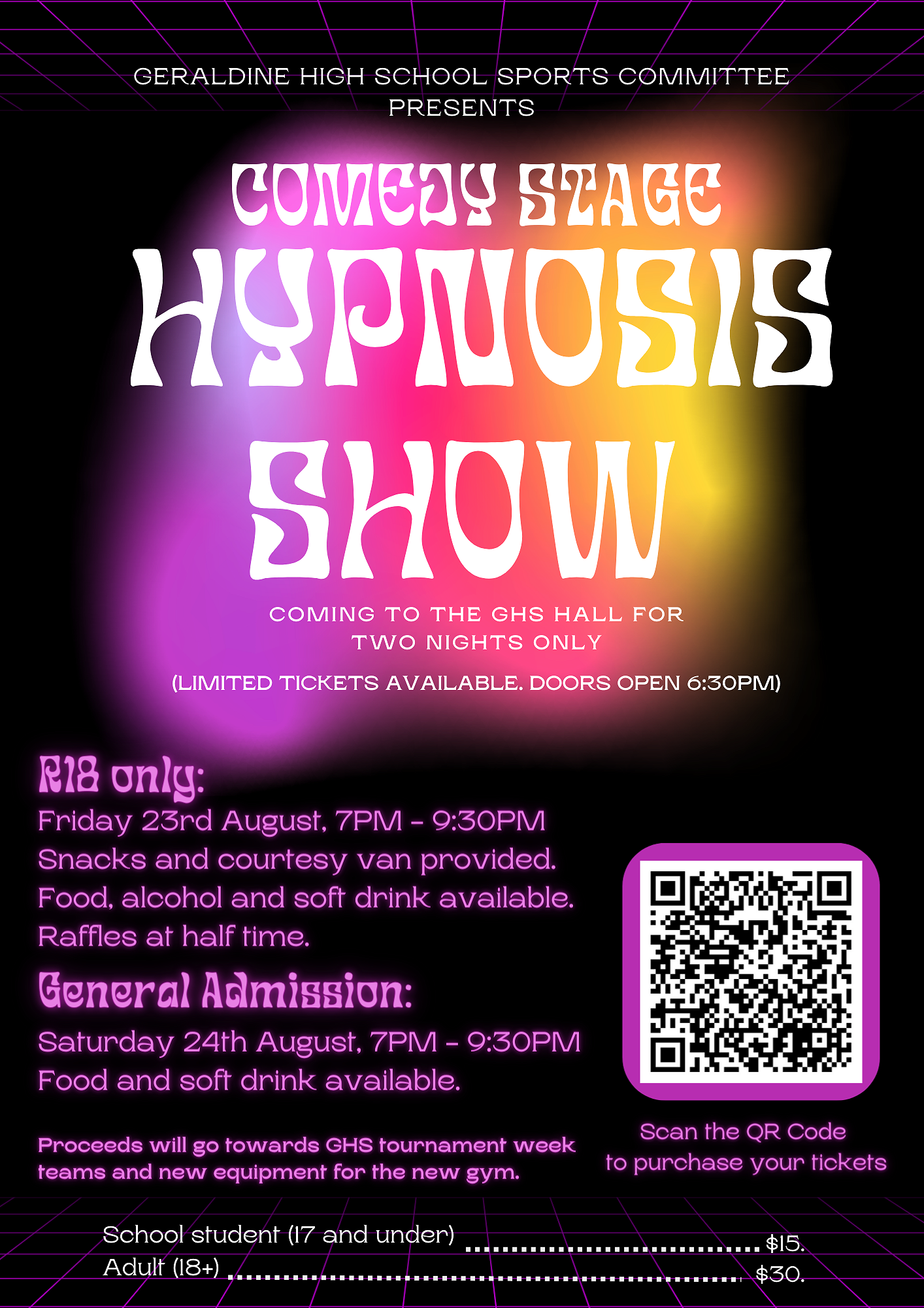 This week, GHS Sports Committee are hosting a Comedy Hypnosis Show. This show kicks off with an R18 event on the 23rd August and then a family show on the 24th August.