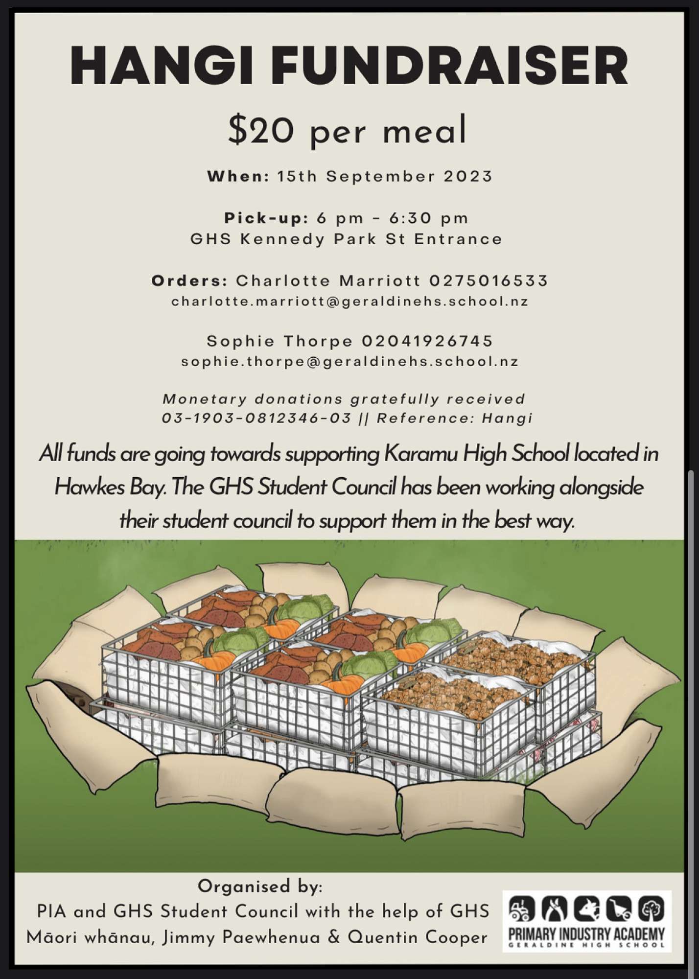 The GHS Student Council and PIA are preparing a Hāngi on the 15th of September in support of Karamu High School. Karamu High School is located in Hawkes Bay where their community was heavily impacted by Cyclone Gabriel. All funds raised will be going towards supporting the Hawkes Bay Community. To order, please contact Charlotte Marriott or Sophie Thorpe on the details on the flier! $20 per Hāngi Meal.