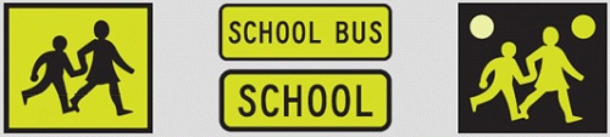 These signs are displayed on school buses. If a school bus has stopped, you must slow down and drive at 20km/h or less. This applies if: