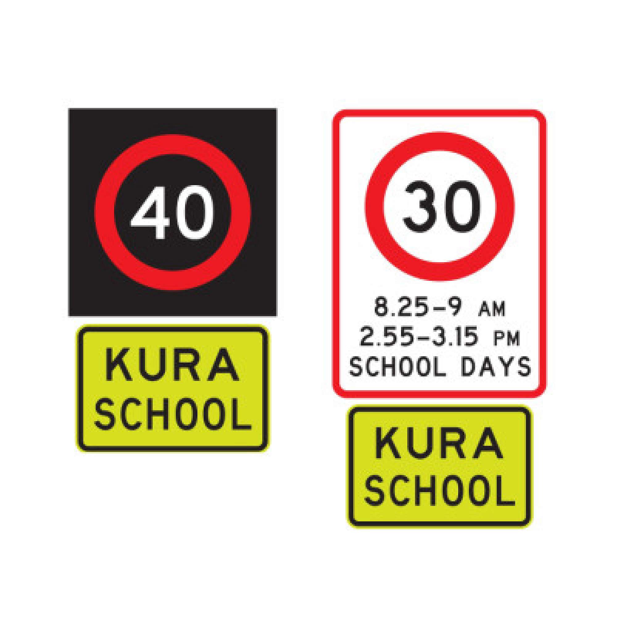 The sign on the left indicates the start of the school speed limit. If either 30 or 40 km/h is visible the red ring will flash, indicating the maximum speed past the school until the school speed limit ends.
