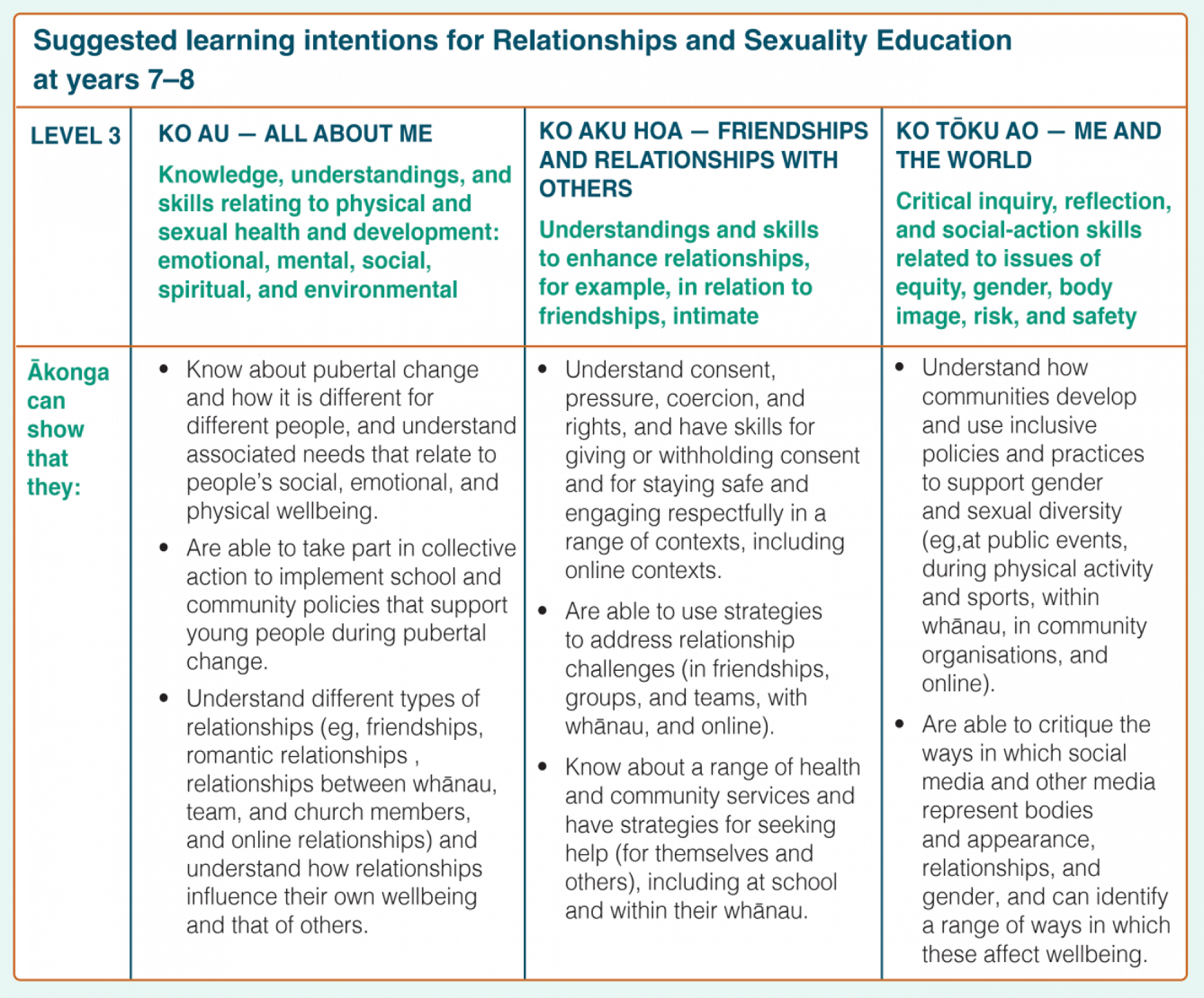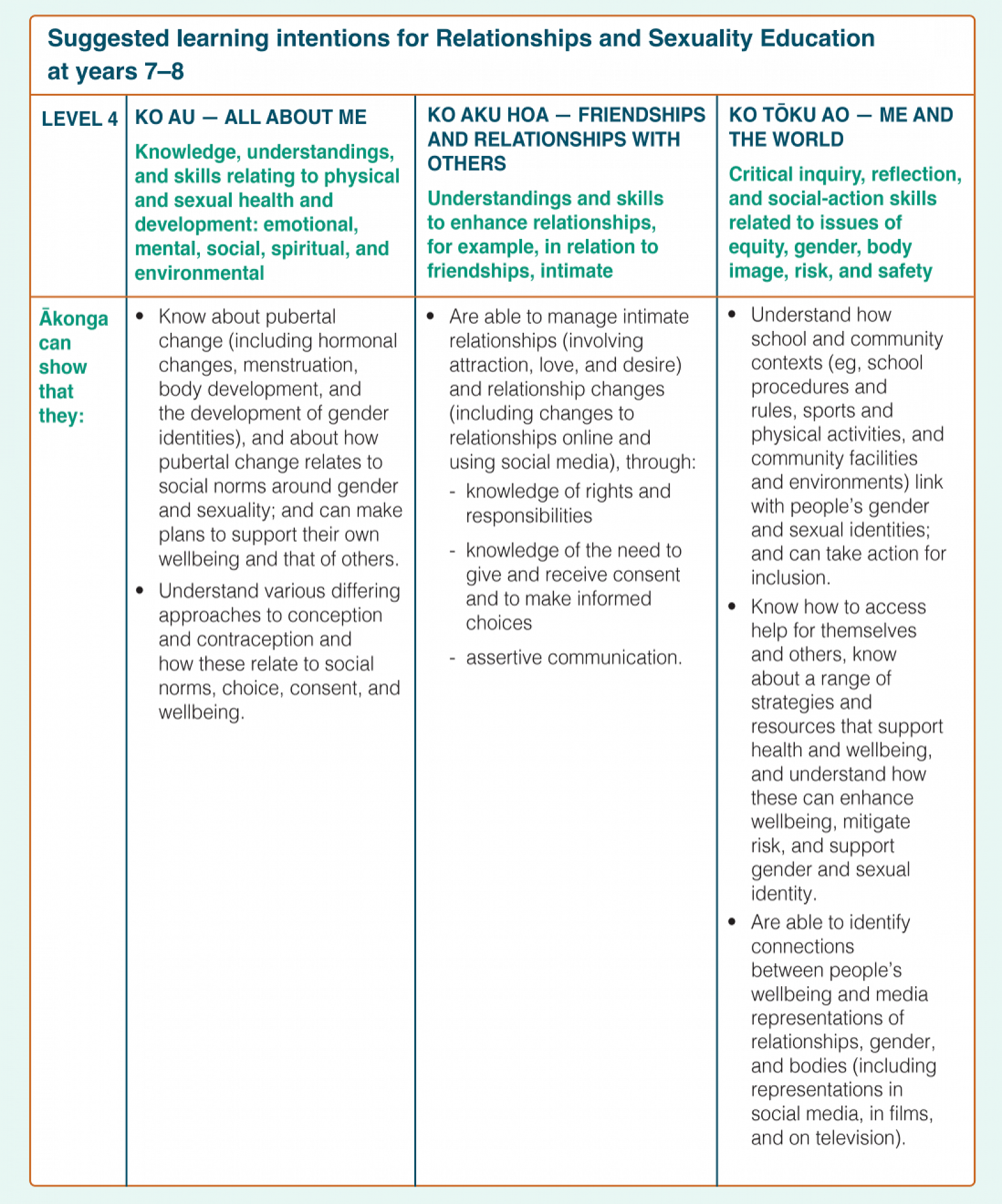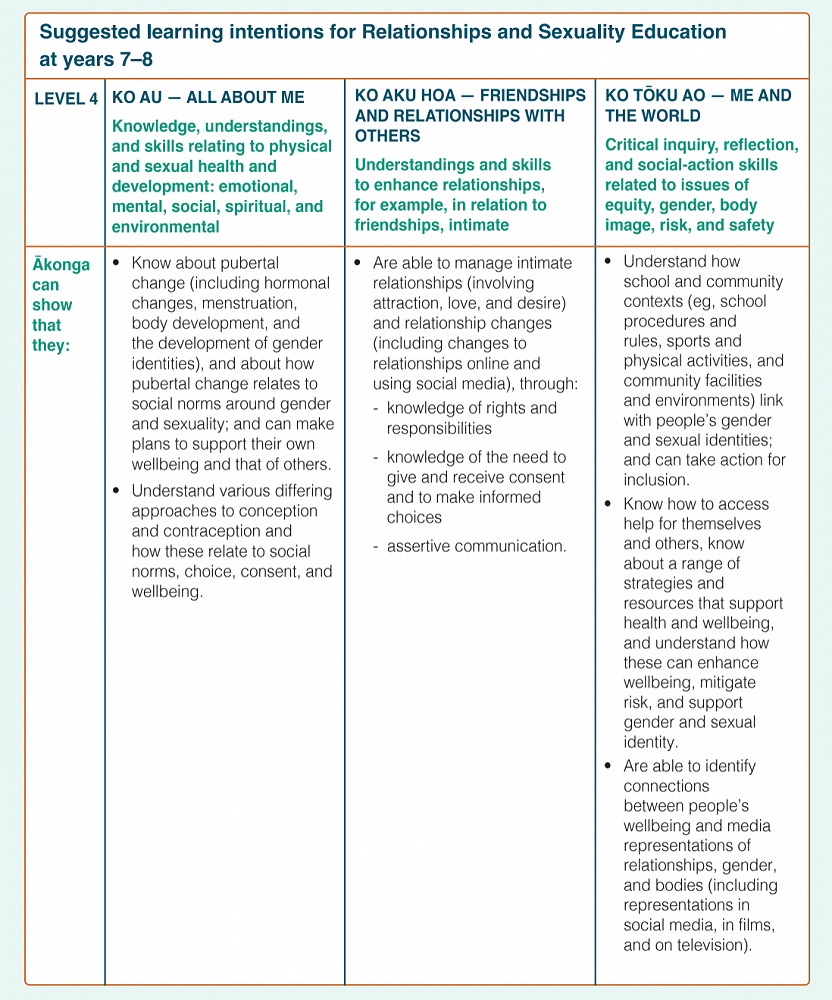 RSE in years 7 and 8 focuses on respectful relationships; diverse gender and sexual identities; pubertal change; body image; intimate relationships and sexual attraction; conception and contraception; bullying and discrimination; influences of the media; communication and decision-making skills; consent; being safe online; support people and community organisations; celebrating diversity.