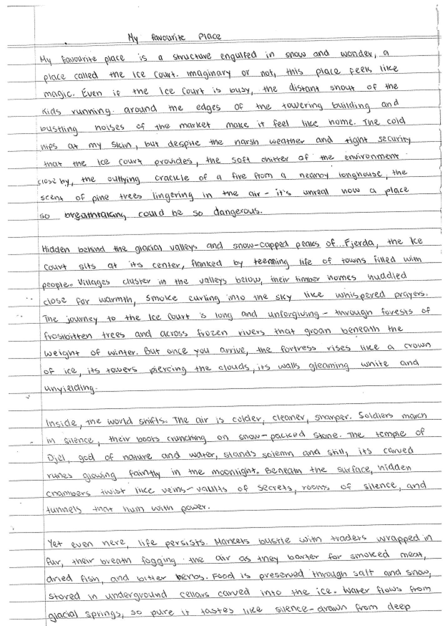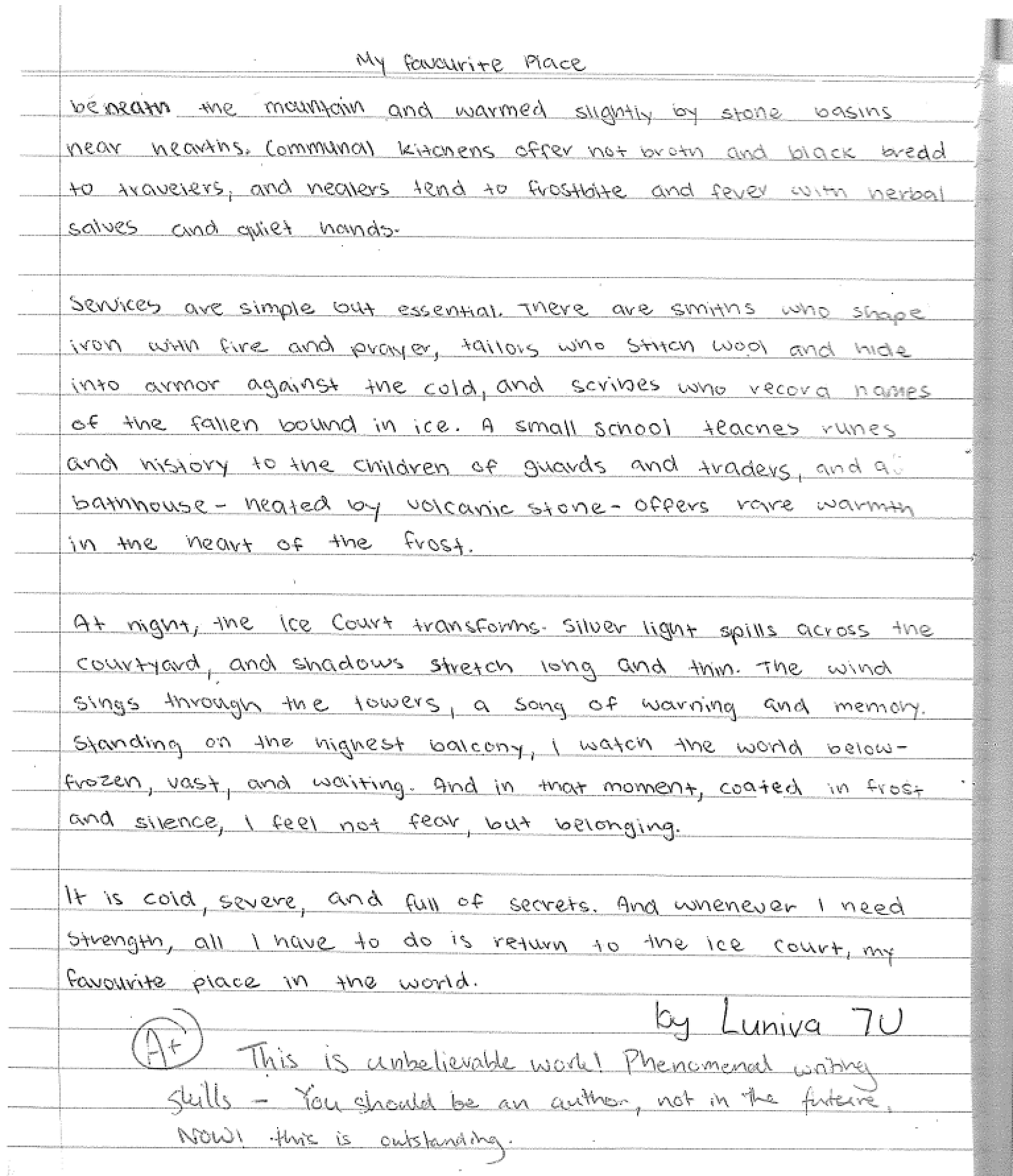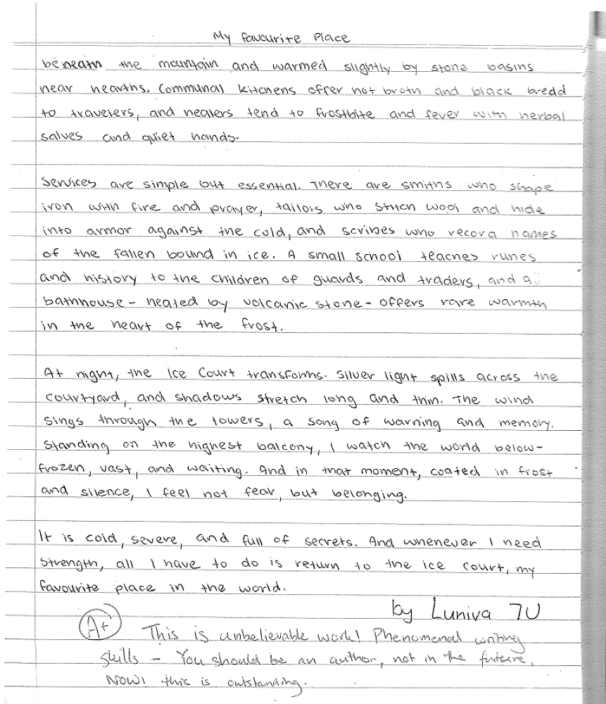 Students also sampled different writing genres as part of their studies in geography. Year 7 studied the topic of "Place and Liveablity" The following is a sample from Luniva D. of 7U - Writing activity 'My Favourite Place'