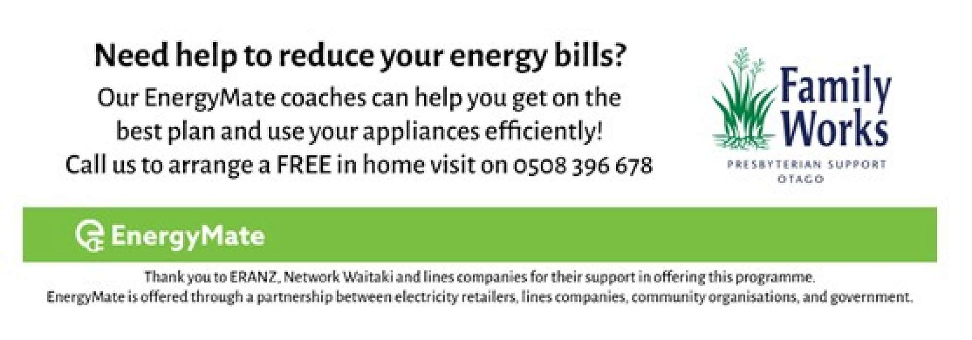 Here at Family Works, Presbyterian Support Otago we have a free service called EnergyMate. An EnergyMate coach can come to your home, give you some tips on how to have a warmer, dryer home , use your appliances efficiently, help you to read and understand your power bill, and ensure you are on the best power plan for you and your whānau. To find out more or book in a session with one of our EnergyMate Coaches please phone 0508 396 678 or email us at energy.mate@psotago.org.nz.