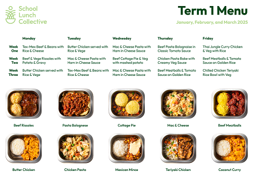 In 2025 Green Island School continues to offer healthy school lunches. Compass is the company that has taken over nationwide. The food is prepared in the North Island, then frozen and sent to Dunedin. It is heated up in a commercial kitchen operating out of the Stadium and delivered in aluminium trays each day in polystyrene boxes to keep the meals warm. The menu for term 1 is in the picture. Note it is a three-week rotation. If you have any changes in dietary requirements, contact the office so we can update our records.