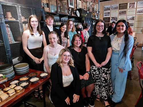 Greymouth High School students 'Aroma Uru' received the West Coast Trades Academy Award for Best Community Focused Business (Prakriti Dhakai, Marty Rochford, Sophie Donaldson, Paris Jackson-Roberts). Also pitching on the night were Tierley Wilson and Kaley Christie from 'Hauora Care' packages.