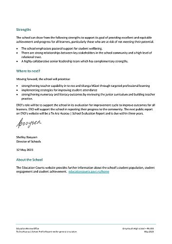 ERO maintains a regular review programme to evaluate and report on the education and care of young people in the schools. Our school worked alongside ERO to write our Profile Report. This type of report will only happen once as part of our initial engagement with Te Ara Huarau. The profile report reflects our strategic goals and a shared evaluation focus one or more areas that are important to us as we work together to improve outcomes for all our learners. ERO, like us, have a strong focus on equity and excellence. Future reporting will show our progress and achievement towards meeting the goals we have set. Public reports like the Profile Report are published on ERO’s website.