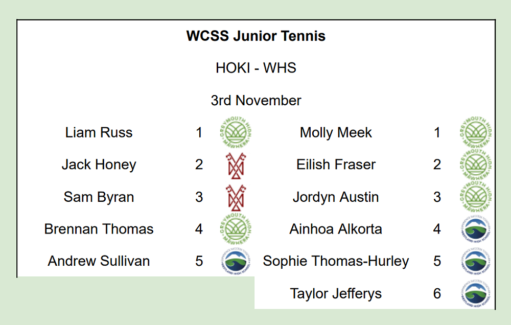 Greymouth High school students made a successful foray south to Hokitika to play in the West Coast Secondary Schools Junior Tennis Tournament. Molly Meek, Eilish Fraser, Jordyn Austin, Liam Russ and Brennan Thomas all played well and demonstrated outstanding sportsmanship.