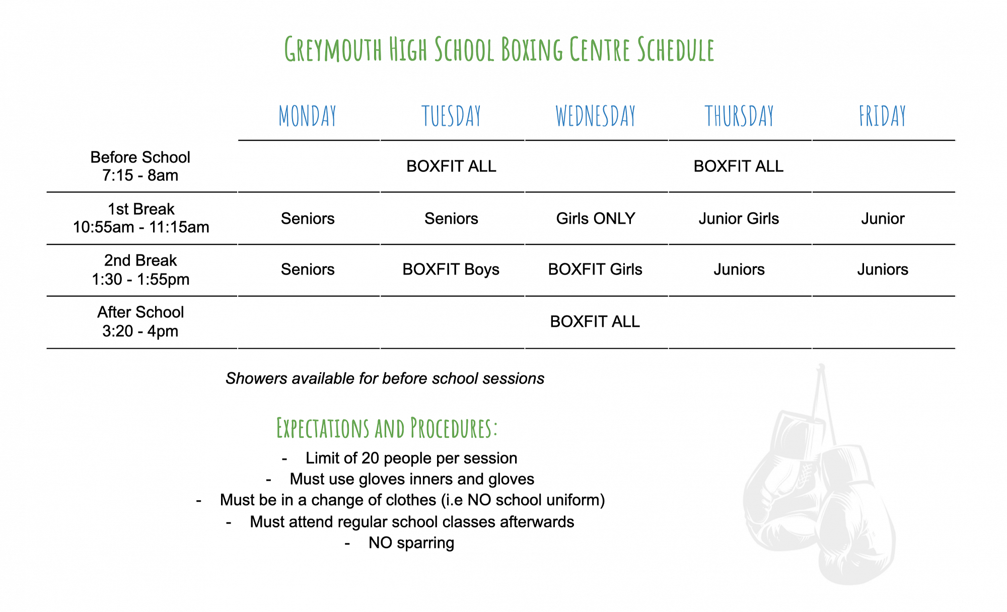 All sessions are located upstairs in the new gym and are open to all GHS students and staff members. Gloves and glove liners are provided. Please bring a drink bottle and sweat towel.