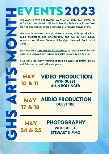 This year we have designated May as Arts Month |Te Marama Toi at GHS to coincide with NZ Music month | Te Marama Puoro. We are hopeful that this is the beginning of a regular annual event.