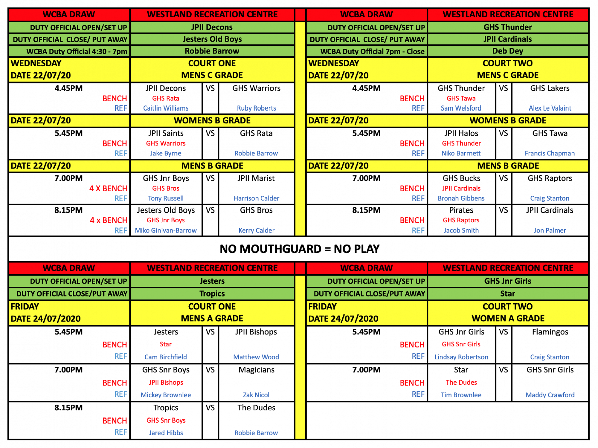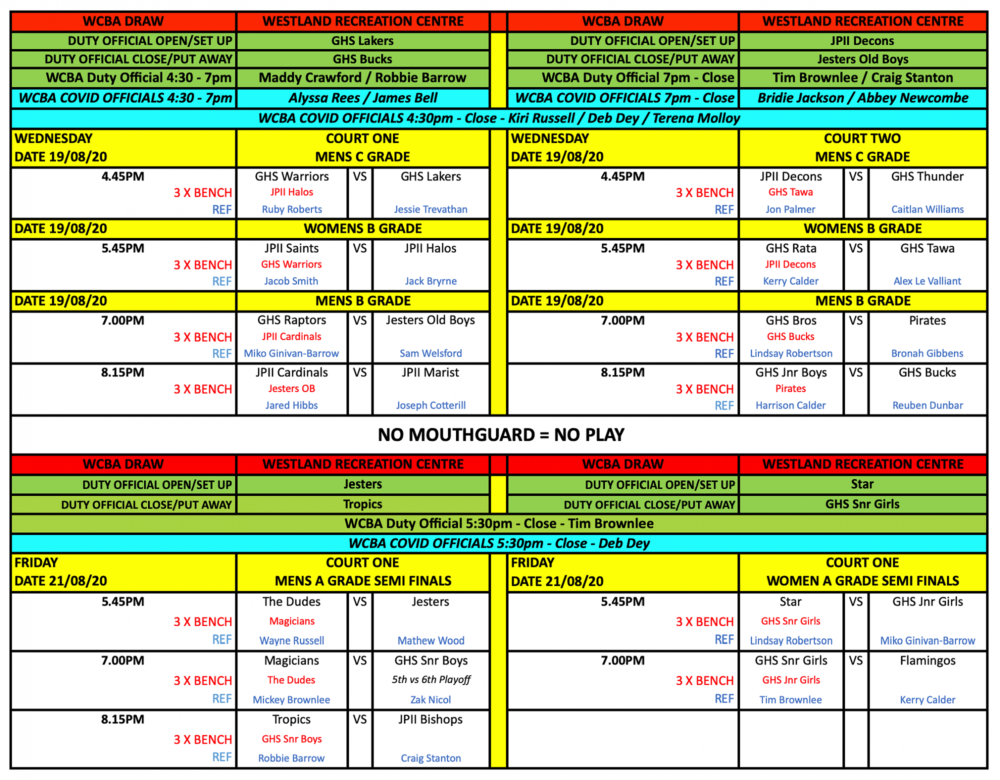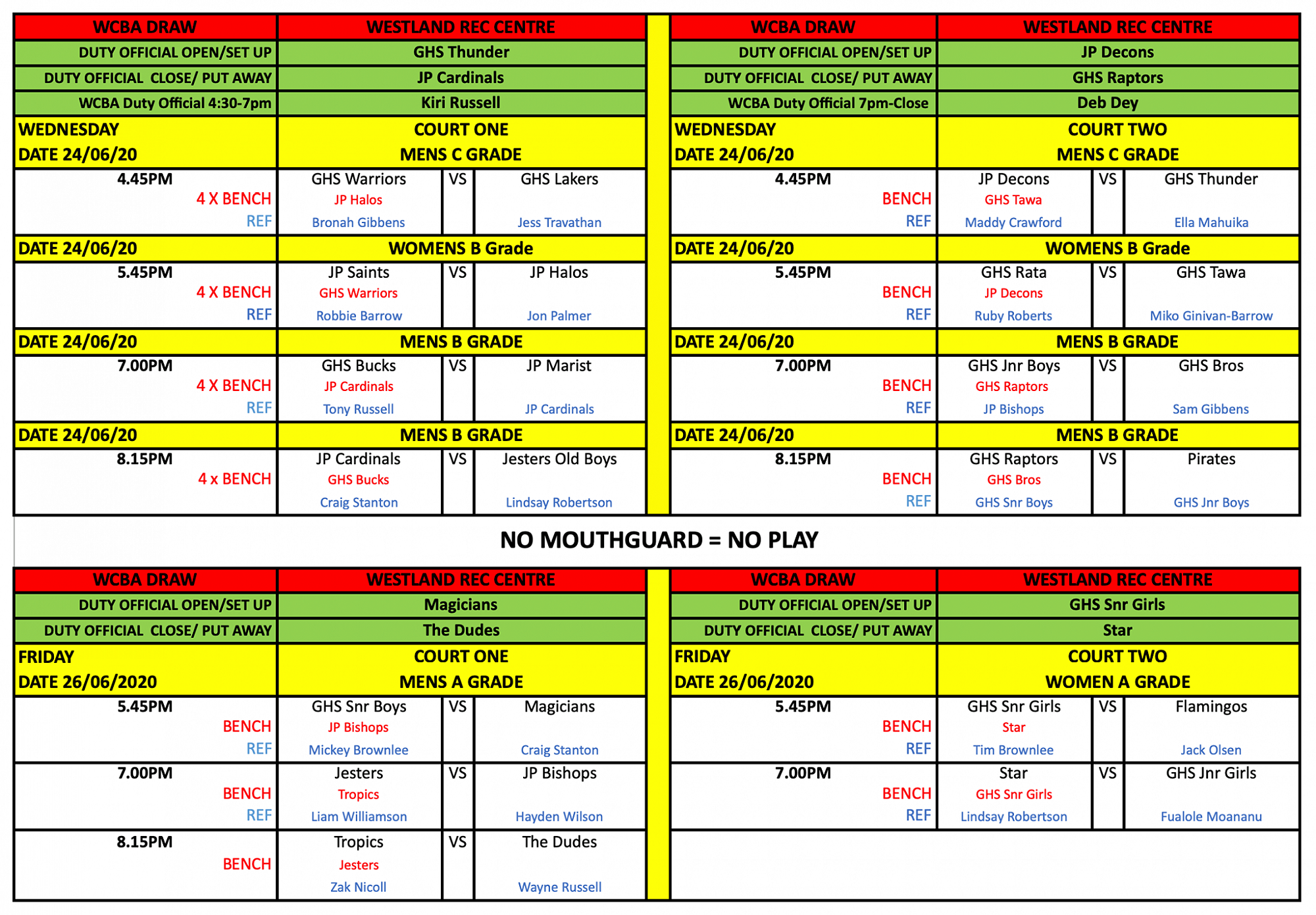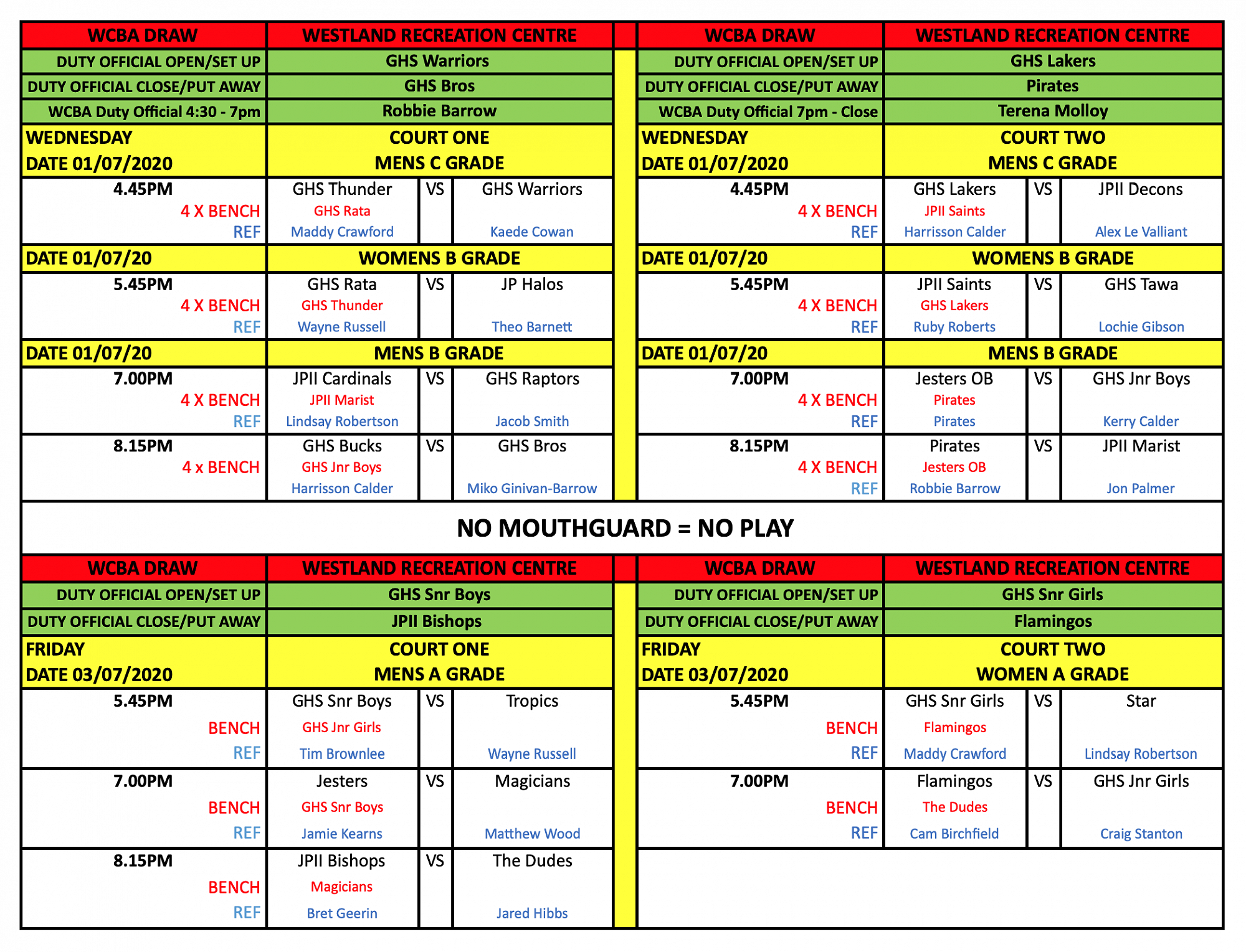 Newest draws posted at the top of this article - double check draw for your team's game time, refereeing and bench duties. Best of luck for your games!