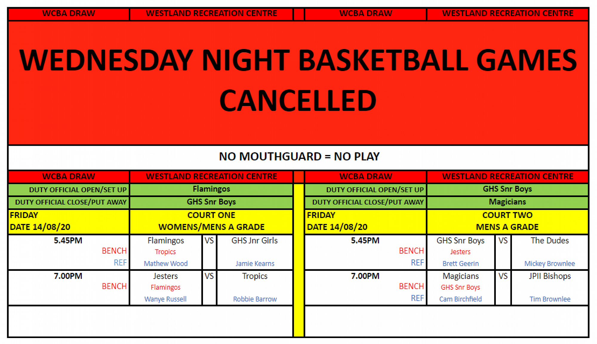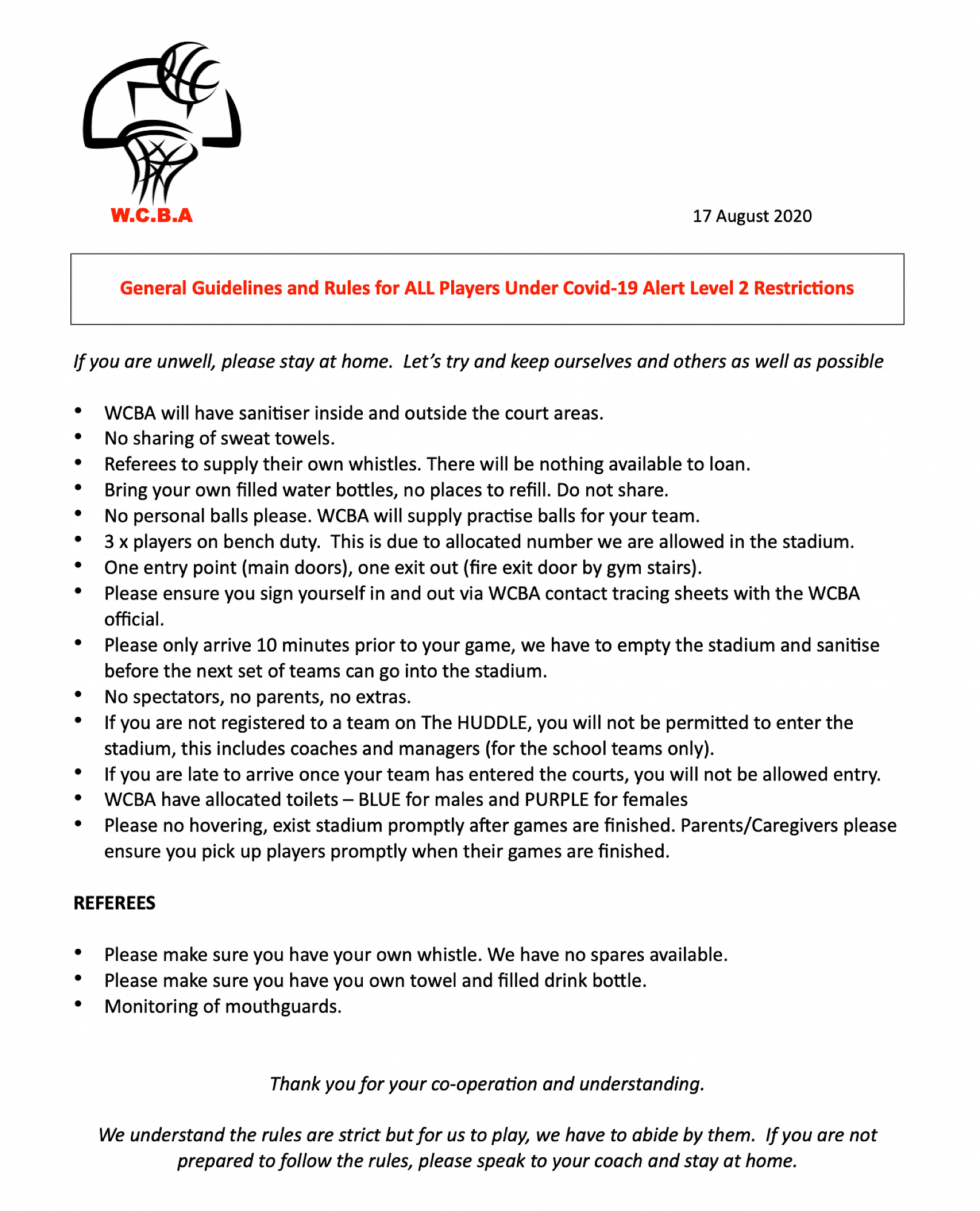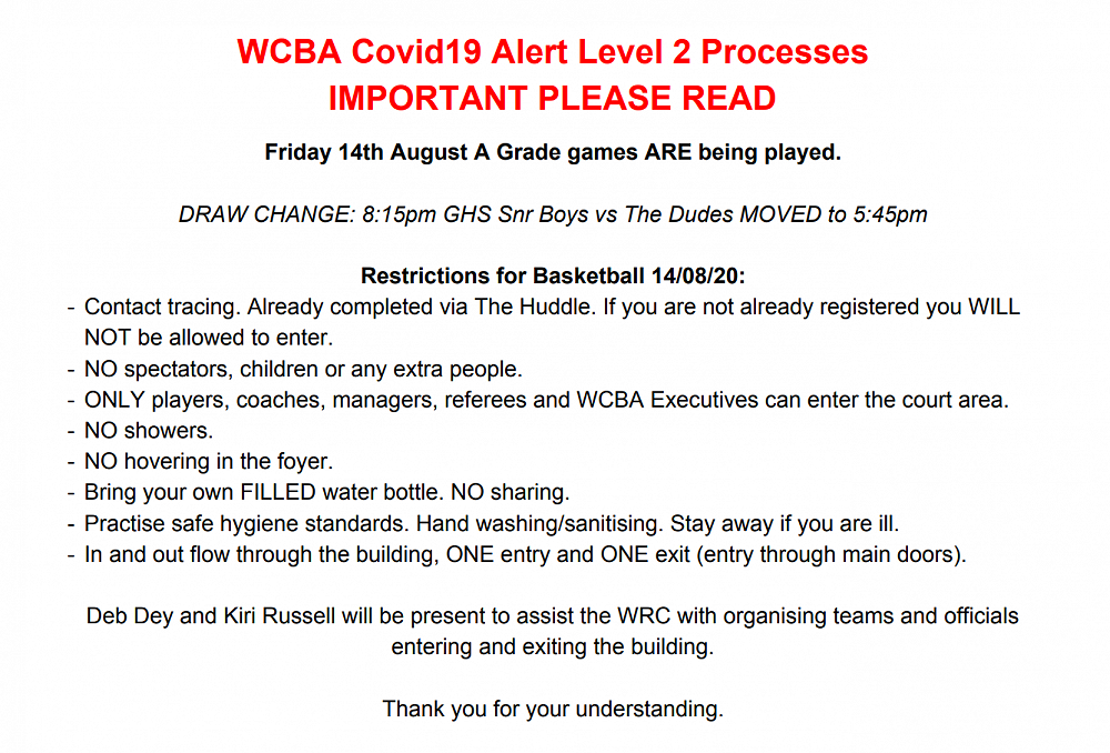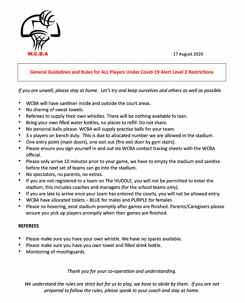 Reminder we are still playing under Alert Level 2 protocols, see below for a refresher. Please ensure you follow ALL instructions from the WCBA Officials.