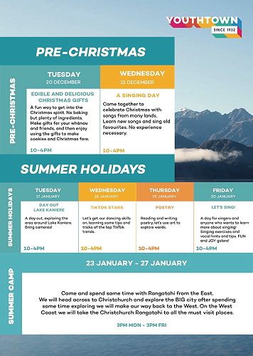 Please see schedule below f the holiday programme that will be running this summer. You will see there is a long camp and this is the first time we are managing to bring groups over from Christchurch Ōtautahi to the Coast. It is very exciting to know that we will be showing people where we live and helping others to experience what we have here.