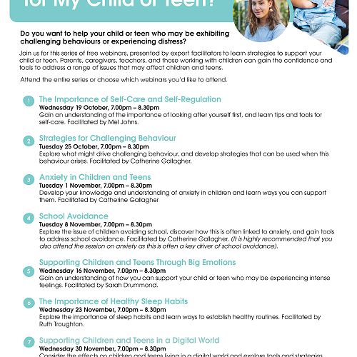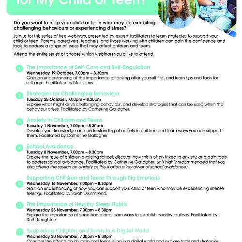 Free Webinars! This series was created for parents, caregivers and those working with children and teens. Please send out to your contacts or anyone who may be interested. More information and how to register is on the attached flyer.