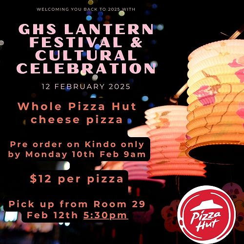 Pre Ordering Pizza: Don't have time to make a picnic? Pizza Hut cheese pizza can be preordered through Kindo NOW. Whole pizza only - $12. Cut off for ordering is Monday 10th Feb 9am. Pick up on the night from Room 29 at 5:30pm.