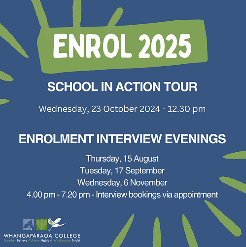 2025 enrolments are open for in-zone learners, years 7 - 13 (a decision on whether or not Whangaparāoa College will be accepting out of zone enrolments for 2025 will be made by the school's Board in June 2024).
