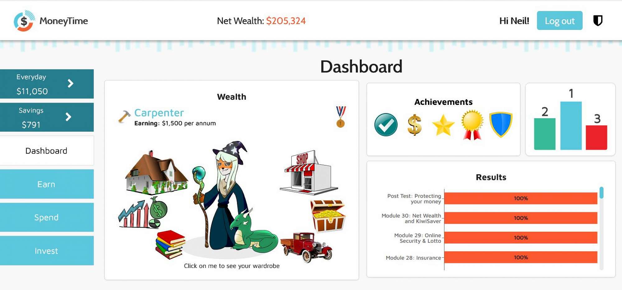 - Comprehensive yet fun game component where students learn from making their own financial decisions on spending, saving, donating and investing.