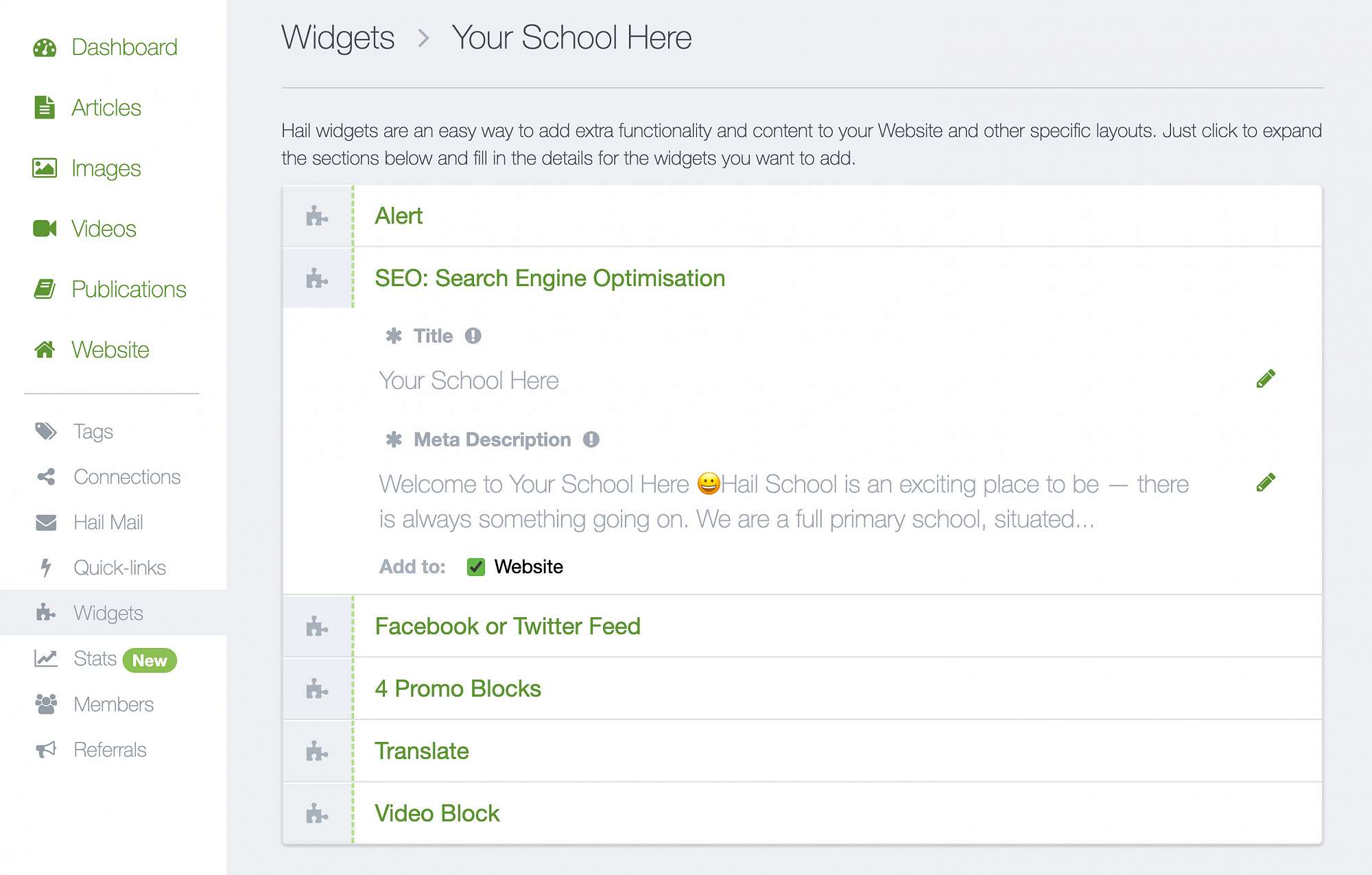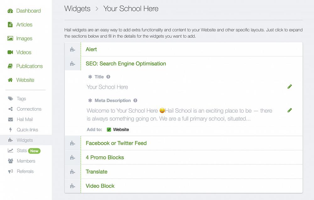 The widgets are live now! Just be sure to refresh Hail in your browser for all the latest. And don't worry if you're not confident with SEO concepts. This release also includes optimisations to your website's default SEO factors. So even if you leave the Title and Description as is, you'll still have enhanced SEO.