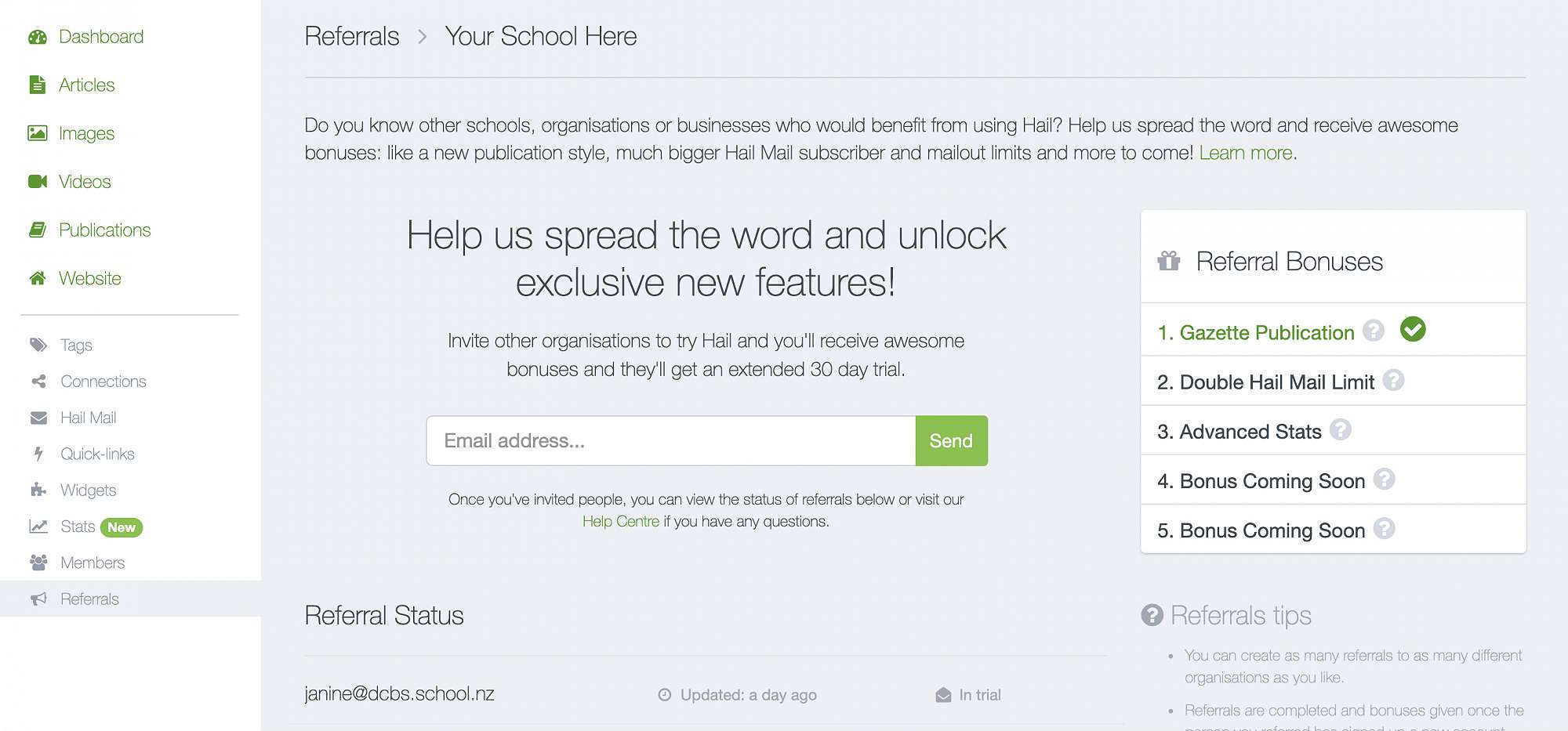 Do you know other schools, organisations or businesses who would benefit from using Hail? Help us spread the word and receive awesome bonuses: like a new publication style, much bigger Hail Mail subscriber and mailout limits and more to come!