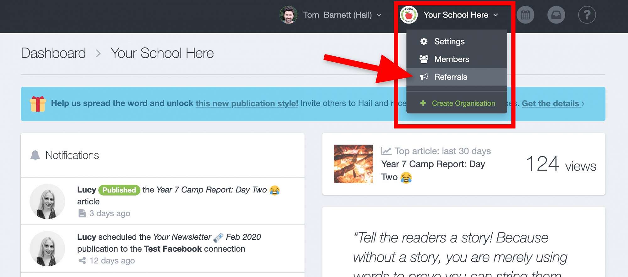 Our referral programme can be found in the main dropdown organisation menu at the top-right in Hail...