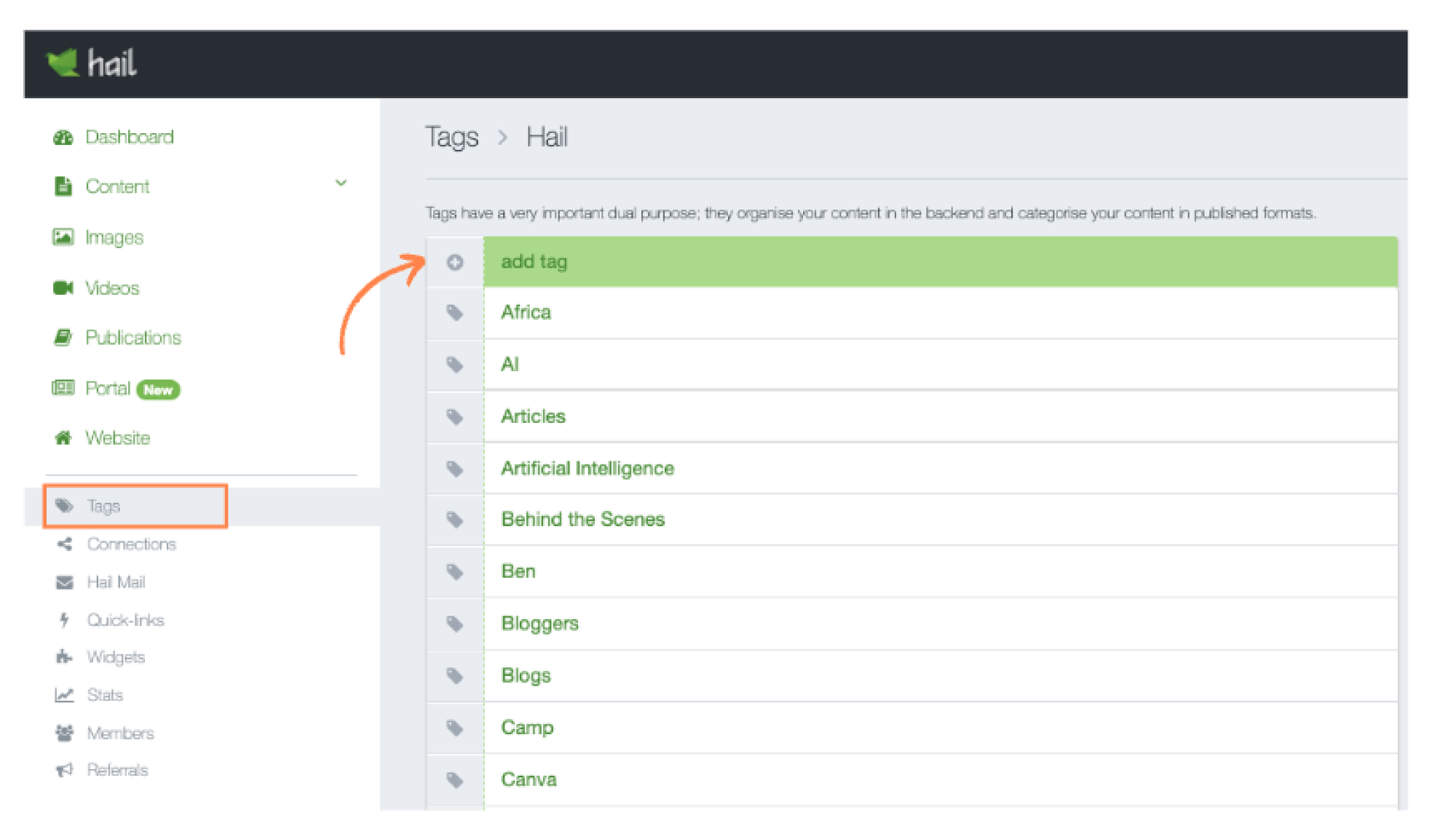 Note: only Hail organisation Owners, Admins and Publishers can add new tags. Contributors can only add existing tags to their articles.