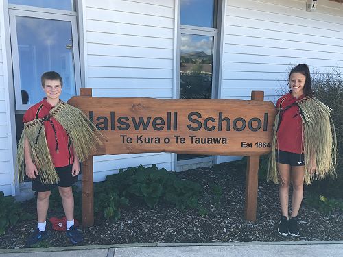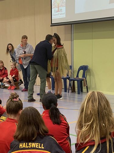 Craig started by doing a karakia (blessing). Then Miss Dovey invited Makaia and Tainui (as Ben was away that day) up to collect the Pākē that Craig’s aunty had made. It had the school colours weaved into the top of it. The male Pākē is smaller because the boys do bigger hand actions in the haka. After Craig put the Pākē over Makaia and Tainui’s shoulders, he did a hongi.