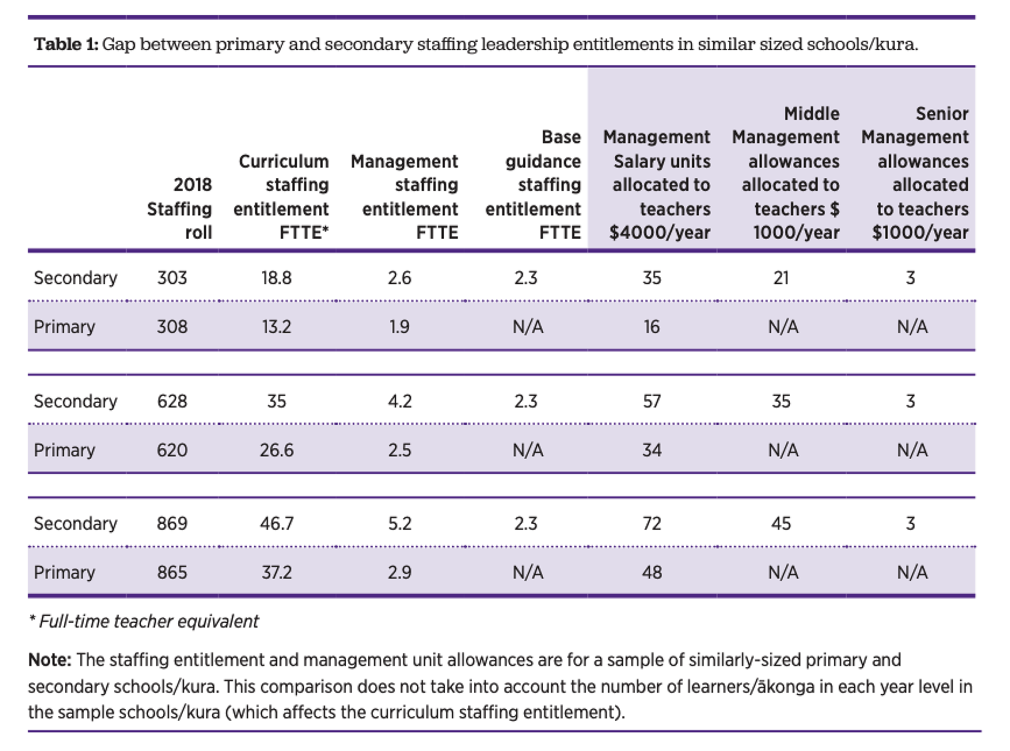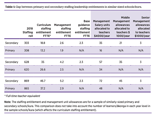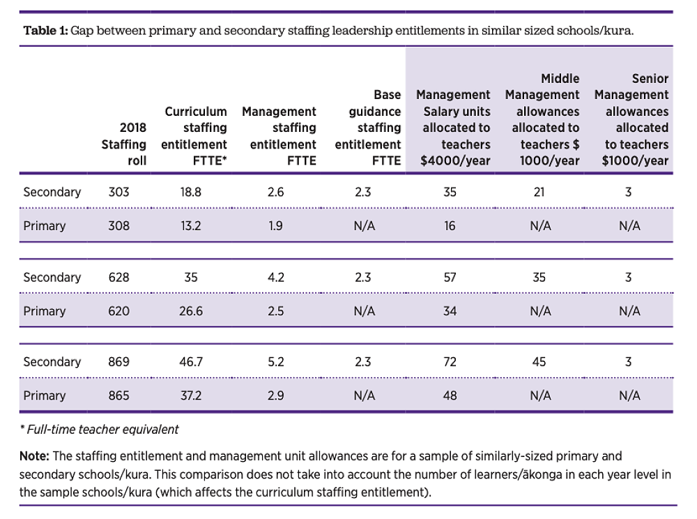 In 2019, the Tomorrow’s Schools Independent Task Force was commissioned to investigate the state of education in New Zealand. The Our Schooling Futures: Stronger Together Whiria Ngā Kura Tūātinitini report (attached) was published following months of consultation with stakeholders. The report had several key recommendations for improving education in our country. In particular, the report highlighted the disparity in resources between primary and secondary schools. This is illustrated below: