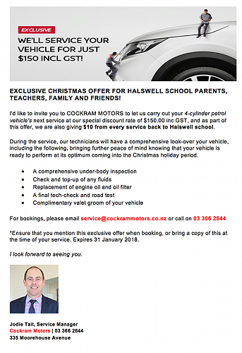 COCKRAM MOTORS is offering Halswell School parents, teachers, family and friends an exclusive opportunity to service their vehicle at a special discount rate of $150 inc GST, with $10 from every service given back to Halswell school. See the attached flyer for more details.