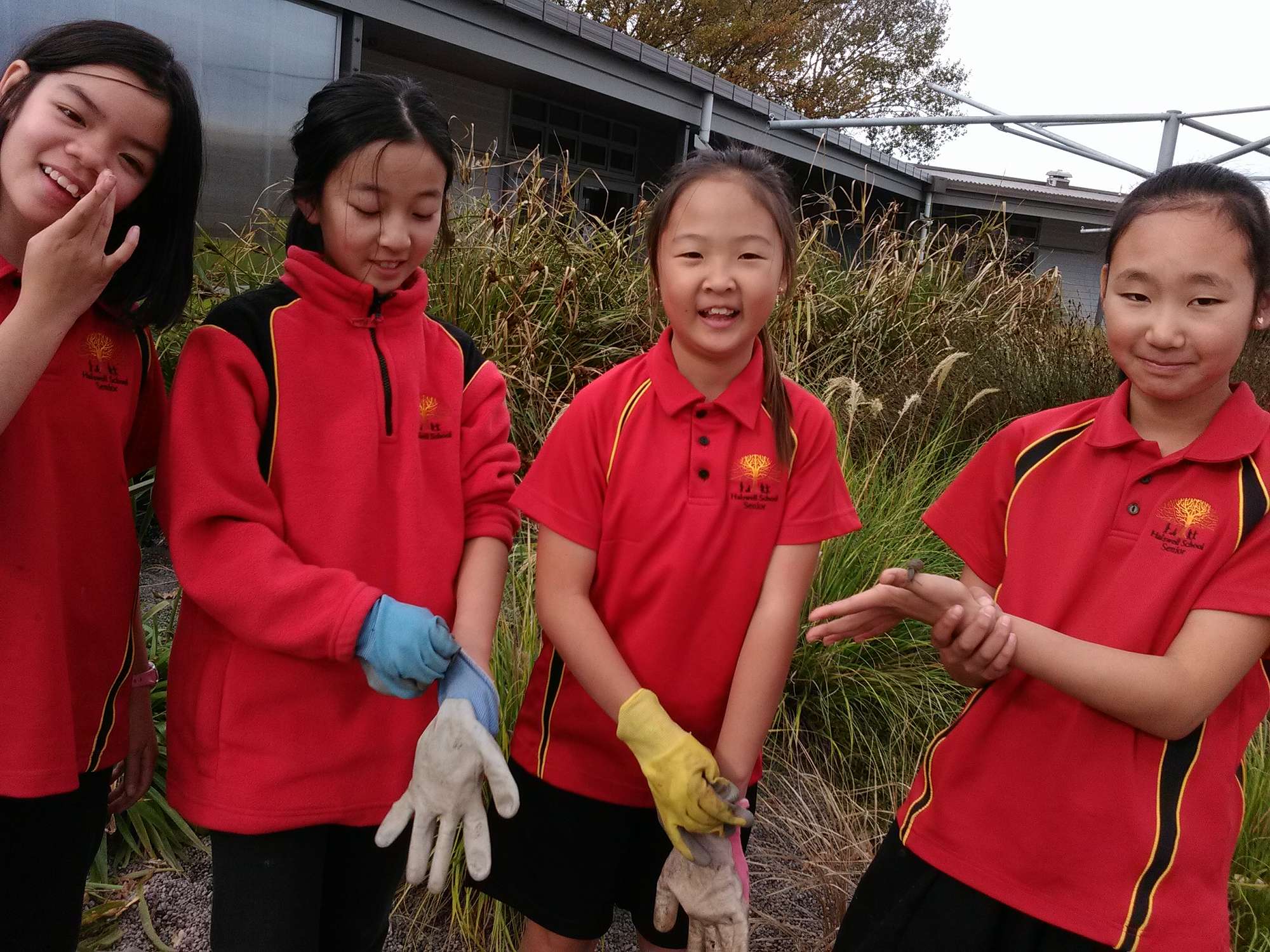 Ashley, Emi, Sarah and Sihyeon and a snail have helped establish the water gardens.