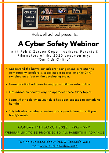 Please note that the Cyber Safety Evening facilitated by Rob and Zareen Cope that was due to take place last year has been rescheduled as a webinar and will now take place on Monday 14 March (7.00 pm-9.00 pm). Details about the event are attached.