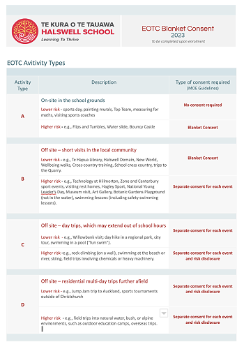 Our school uses a process which is monitored by the Principal and School Board to identify and manage risk for all activity types. The Ministry of Education EOTC guidelines identifies four EOTC activity types, each with recommended types of parental/caregiver consent (see table below). Rest assured that all EOTC activities require staff to undertake an analysis of the risks and identify the management strategies required to eliminate, isolate and minimise the risks. Emergency procedures are also in place.
