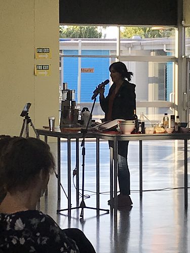 What a lovely relaxed event this turned out to be. Nadia arrived and immediately got down to introducing herself to everyone, organising the kitchen staff (various members of the school community pressed into service) and telling stories. This continued as she demonstrated two of the delicious recipes from her new cookbook, Vegful, along with the help of three of our wonderful school children who all proved highly adept at carrying out her instructions.