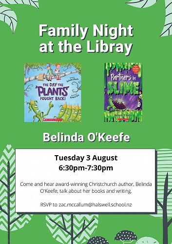 Come along to our Family Night at the Library next Tuesday night (3 August) from 6:30pm-7:30pm to hear award-winning Christchurch author, Belinda O'Keefe, talk about her books and writing. Belinda is the author of the picture book, The Day the Plants Fought Back, and a fantastic new novel called Partners in Slime. It is sure to be another fun Family Night at the Library.