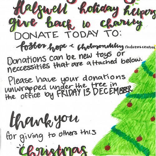 The Halswell Holiday Helpers are a group of 20 Year 5-8 students who are organising our Christmas give back to charity this year. We have decided that our Christmas donations will be given to Cholmondeley Children's Centre and Foster Hope.