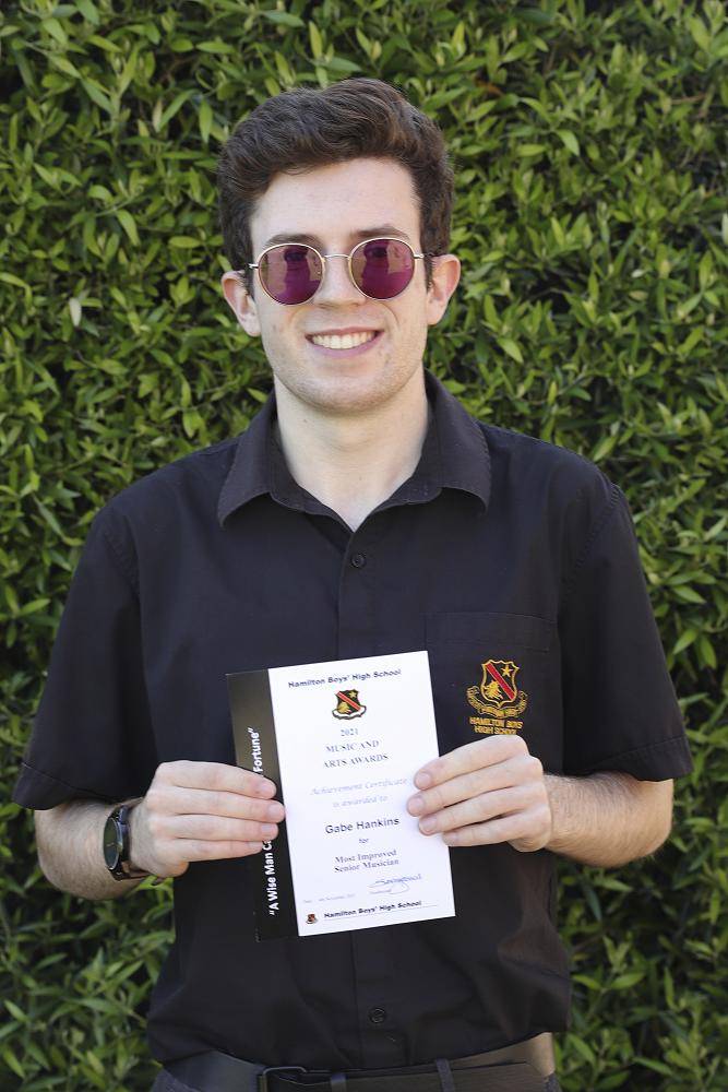 Achievement Certificate for Most Improved Senior Musician to Gabe Hankins
